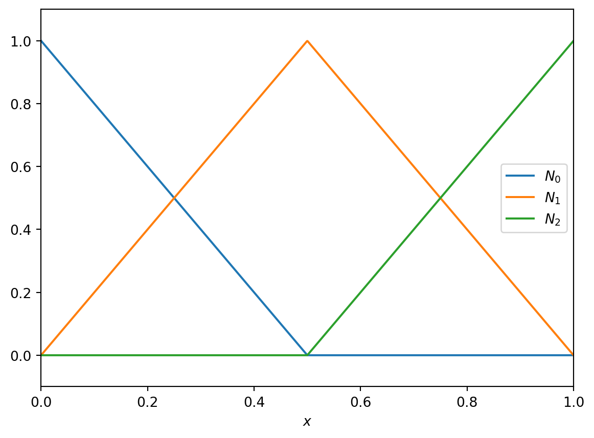 \[ \begin{aligned} N_0(x) &= \begin{cases} 1 - 2 x & 0 \le x \le 1/2 \\ 0 & 1/2 \le x \le 1 \end{cases} \\ N_1(x) &= \begin{cases} 2 x & 0 \le x \le 1/2 \\ 2 - 2 x & 1/2 \le x \le 1 \end{cases} \\ N_2(x) &= \begin{cases} 0 & 0 \le x \le 1/2 \\ 2 x - 1 & 1/2 \le x \le 1 \end{cases} \end{aligned} \tag{3.9}\]