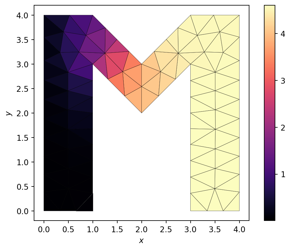 return nodes, IEN, ID, boundariesThe results of using a more complex mesh generator (in this case dmsh) on a more complex domain, but still solving the heat equation using exactly the functions outlined in the exercise below, is shown in (Figure 4.3).