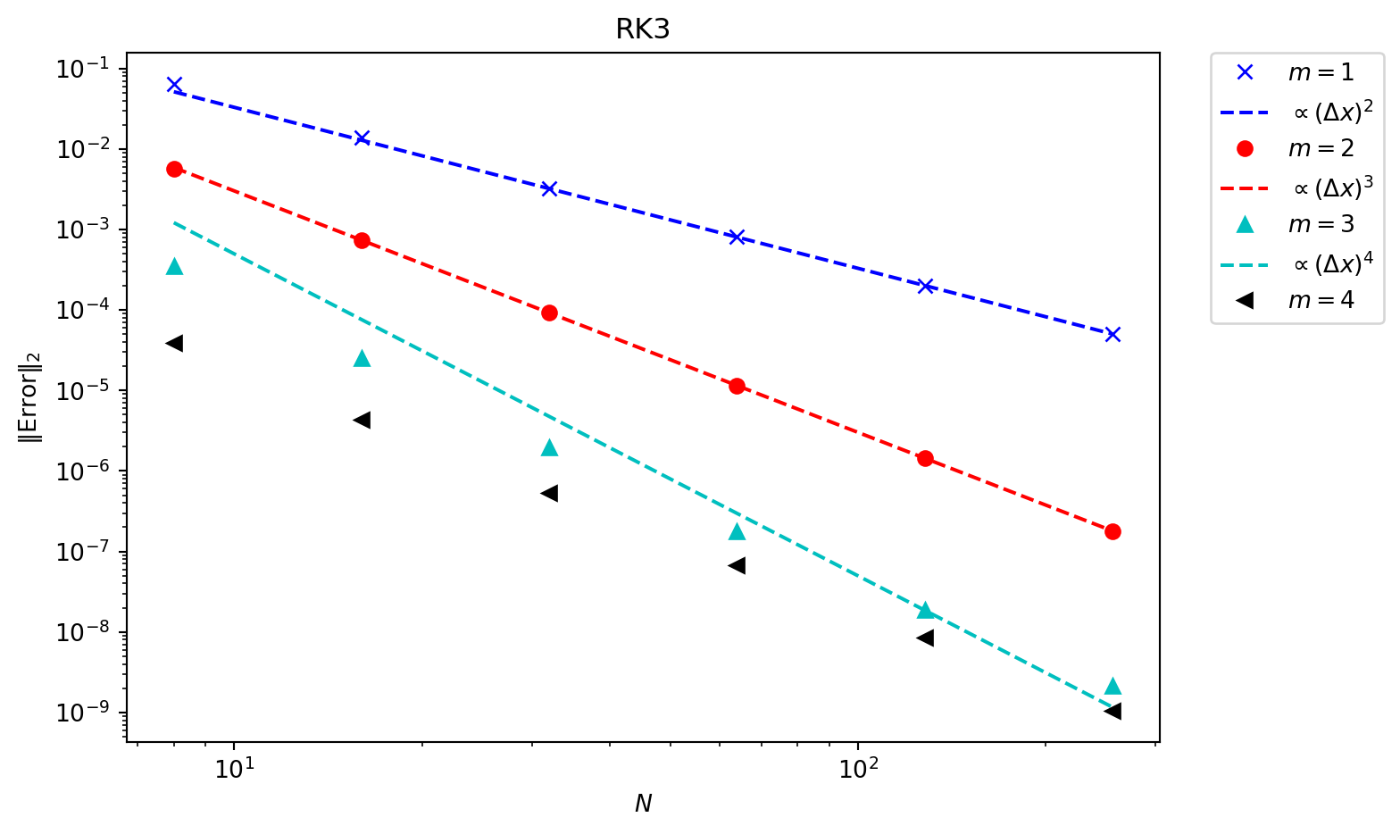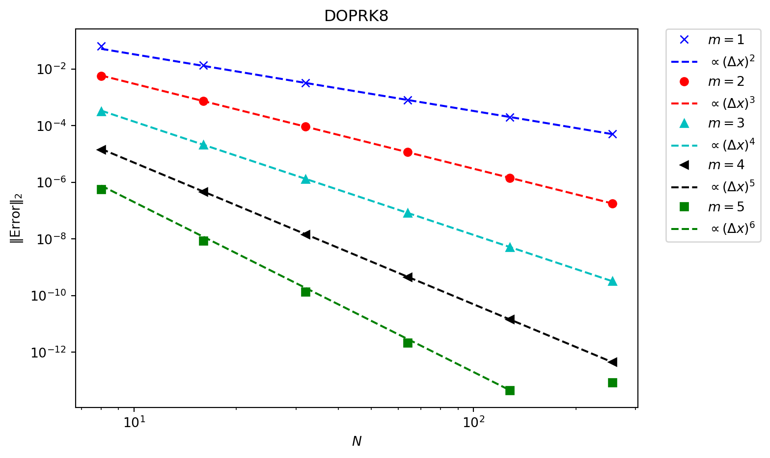 In (Figure 6.5) an \(8^{\text{th}}\) order time integrator is used. This reduces the time integrator error far below what is needed, and we now see that every scheme converges at the expected rate. In more complex systems in multiple dimensions the error from the spatial terms will be much larger, and so lower order methods can be used without compromising the accuracy.