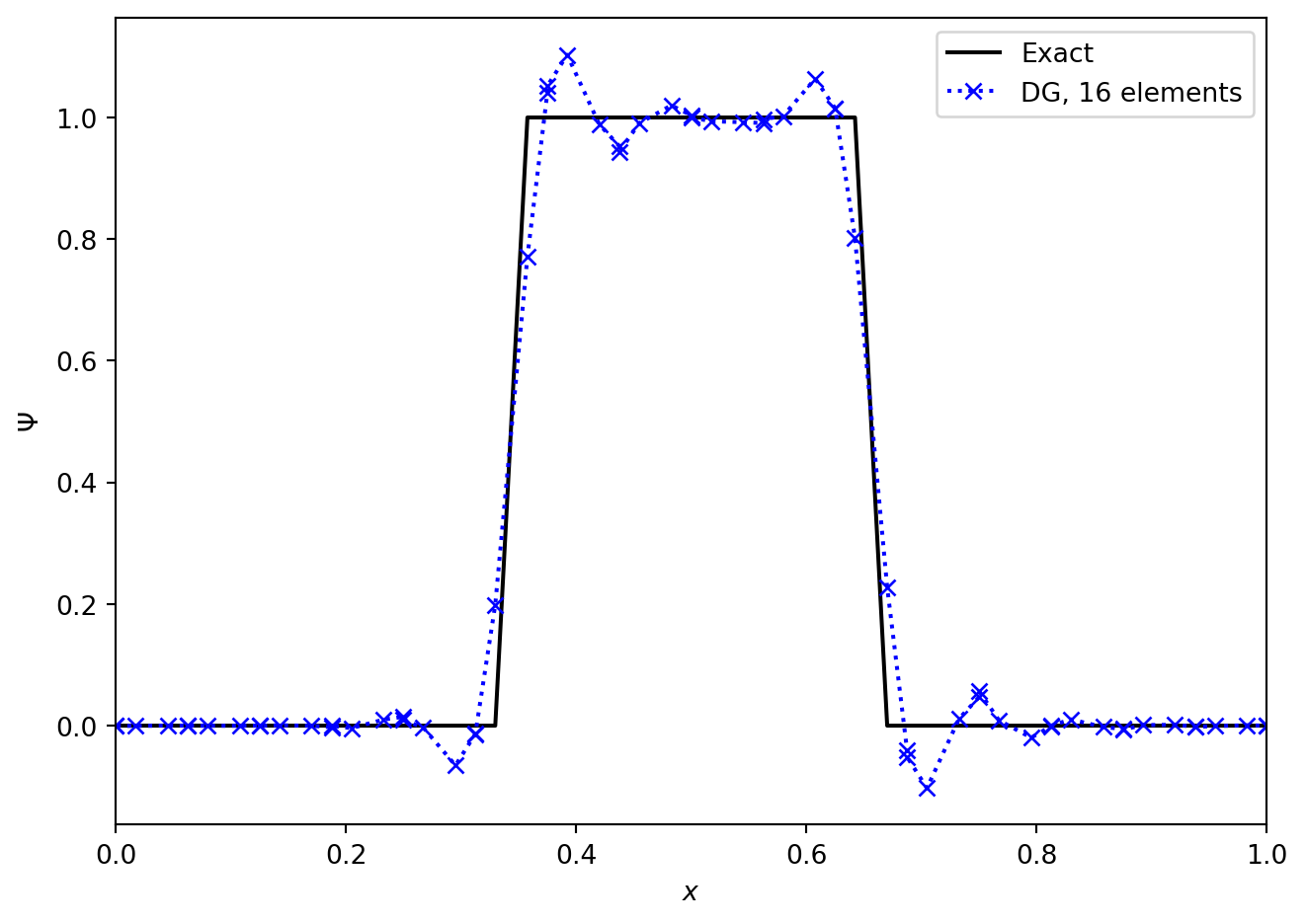 Figures (Figure 6.2) and (Figure 6.3) show the advection of two initial profiles one period around a periodic domain. In (Figure 6.2) we see the excellent performance when applied to a smooth profile. The method is essentially indistinguishable from the exact solution. However, in (Figure 6.3), we see that when the method is applied to a discontinuous initial profile then Gibbs oscillations result. The only “nice” feature of the Discontinuous Galerkin method here is that these oscillations are confined to the elements next to the discontinuities, and do not spread to cover the entire grid.