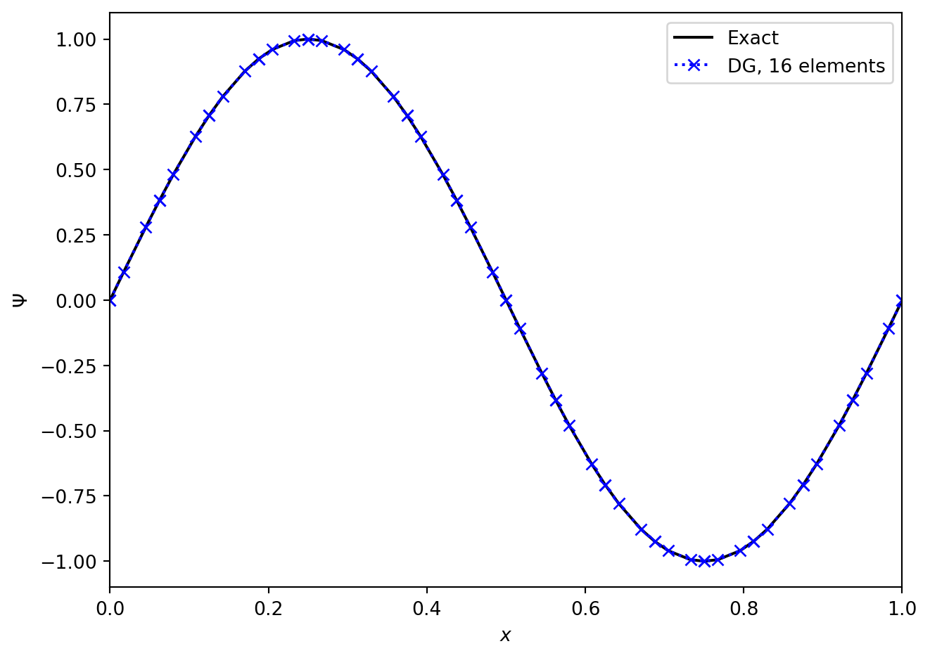We see that, once we have evaluated the mass and stiffness matrices, we can then update all modes \(\symbf{\hat{\Psi}}\) by evaluating the boundary flux term on the right hand side and solving a linear system. This illustrates the small stencil of discontinuous Galerkin schemes: the only coupling to the other cells is through that boundary integral, which only couples to direct neighbours. However, if the flux terms couple different modes (as evaluating them requires evaluating a product of basis functions \(\phi_l(x) \phi_n(x)\)), then the amount of information communicated may still be large. Therefore the communication cost of the scheme is linked to the properties of the basis functions at the domain boundary.