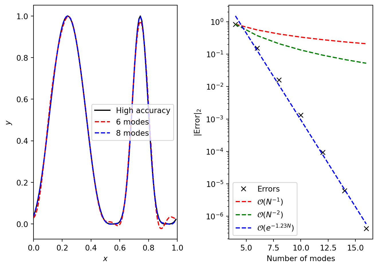 The results of applying a spectral method to non-constant advection can be seen in Figure 2.1. The left panel shows the solution after “half a period”, which is extremely well captured even with very few modes used (look at the solution near the right edge for the largest discrepancies). The convergence plot in the right panel is the key result, however. It shows how the error converges exponentially, which is far faster than any finite differencing scheme (which converges polynomially) can manage.